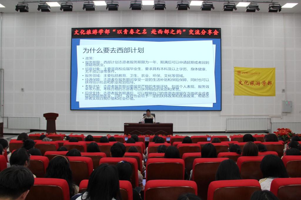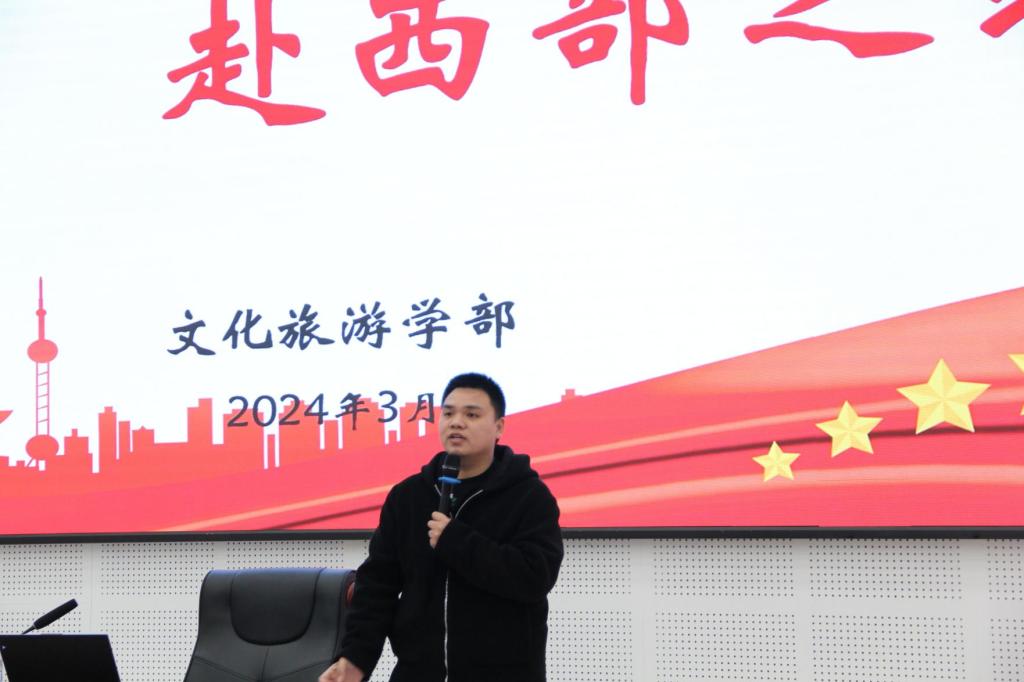 为了促进西部地区的经济发展和社会进步,进一步宣传服务基层优秀西部计划志愿者先进典型,弘扬“奉献、友爱、互助、进步”的志愿精神,引领更多的青年加入西部计划志愿者队伍,全力服务乡村振兴战略,同时为大学生提供锻炼自我、服务社会的机会。文化旅游学部于2024年3月21日在化学报告厅举行“以青春之名 赴西部之约”交流分享会。此次分享会由武国锋老师主持,2019级学长霍英杰主讲,2020级全体在校生参会。