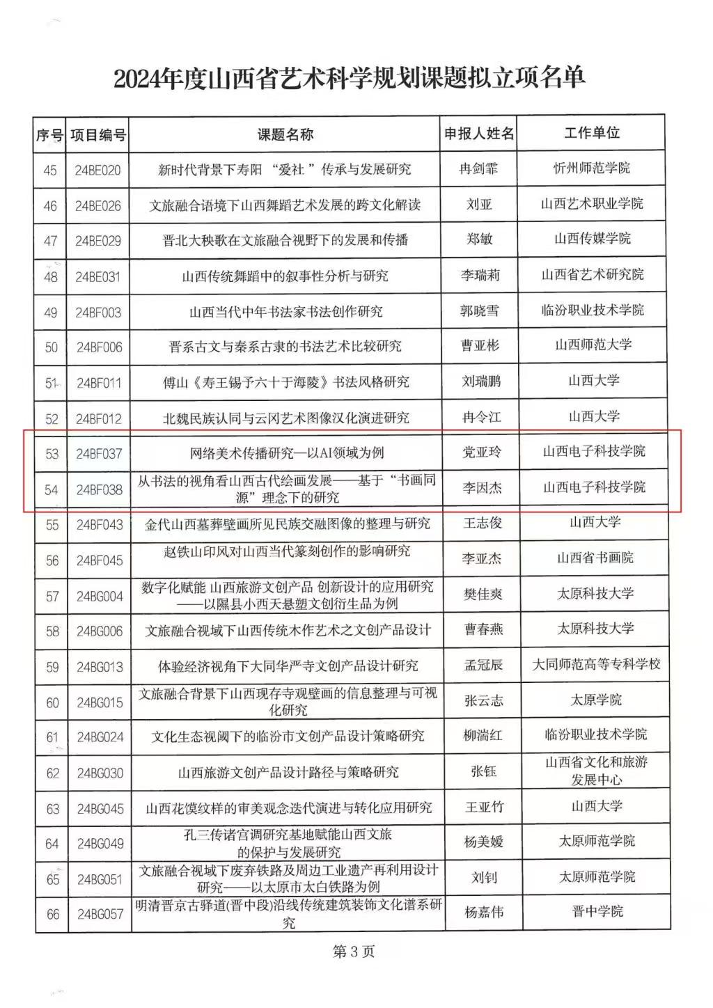 2024年12月12日,山西省文化和旅游厅发布了《2024年度山西省艺术科学规划课题拟立项名单公示》,我院党亚玲的《网络美术传播研究-以AI领域为例》(项目编号:24BF037)和李因杰的《从书法的视角看山西古代绘画发展--基于“书画同源”理念下的研究》(项目编号:24BF038)成功获批。