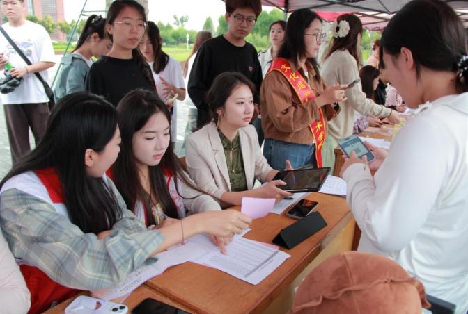 首先,清晨六七点学院 30 余名志愿者已身着红色马甲集结完毕,分赴学院指定关键点位。让新生提前感受学院的专业氛围。完成报到后,新生可前往图书馆门口的专属领取点,拿到学院准备的特色礼物 —— 包含壶口瀑布、克难城等当地著名文化旅游景点介绍的文创挂件与富含专业特色的登机牌,既传递了太阳集团tyc4633的热情,也暗含对新生 “扎根地方文化,探索艺术创作” 的期许。随后,志愿者开启 “一对一” 宿舍引领服务,沿途详细介绍校园的生活配套与专业设施。抵达宿舍楼后,志愿者先帮新生在宿管处登记入住信息,找到房间后,还会逐一演示楼道洗衣机的使用方法,向新生们分享宿舍安全知识,离开宿舍一定要断电锁门,贵重物品要妥善存放,尤其是专业绘画工具、相机等器材。最后回到迎新现场,学院老师们早早到场,亲切地与新生及家长交流,从专业课程设置到未来发展方向,耐心解答每一个疑问;学院领导也亲临现场视察指导,深入了解报到流程、服务保障等情况,对志愿者与工作人员的辛勤付出给予肯定。